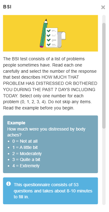The Brief Symptom Inventory (BSI) is a self-report questionnaire with 53 items that provides an overview of symptoms of psychopathology in adults/youngsters aged 13 and older.