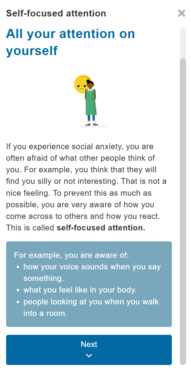 The module is based on the three main pillars of social anxiety: self-focused attention, avoidance and safety behaviours, and unhelpful thoughts.
