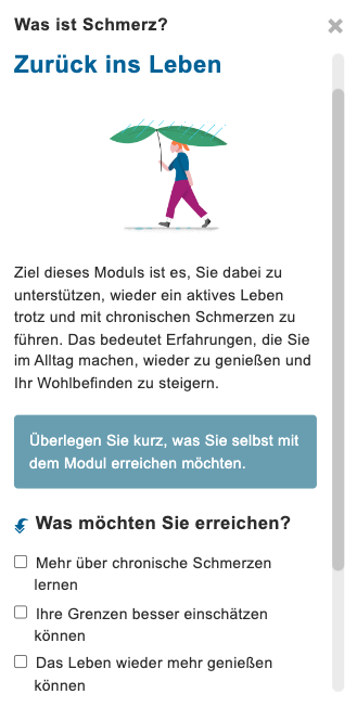 Das Modul eignet sich für Erwachsene, die unter chronischen Schmerzen leiden. Ziel des Moduls ist es, Nutzer:innen dabei zu unterstützen mit ihren Schmerzen einen aktiven Alltag zu führen.