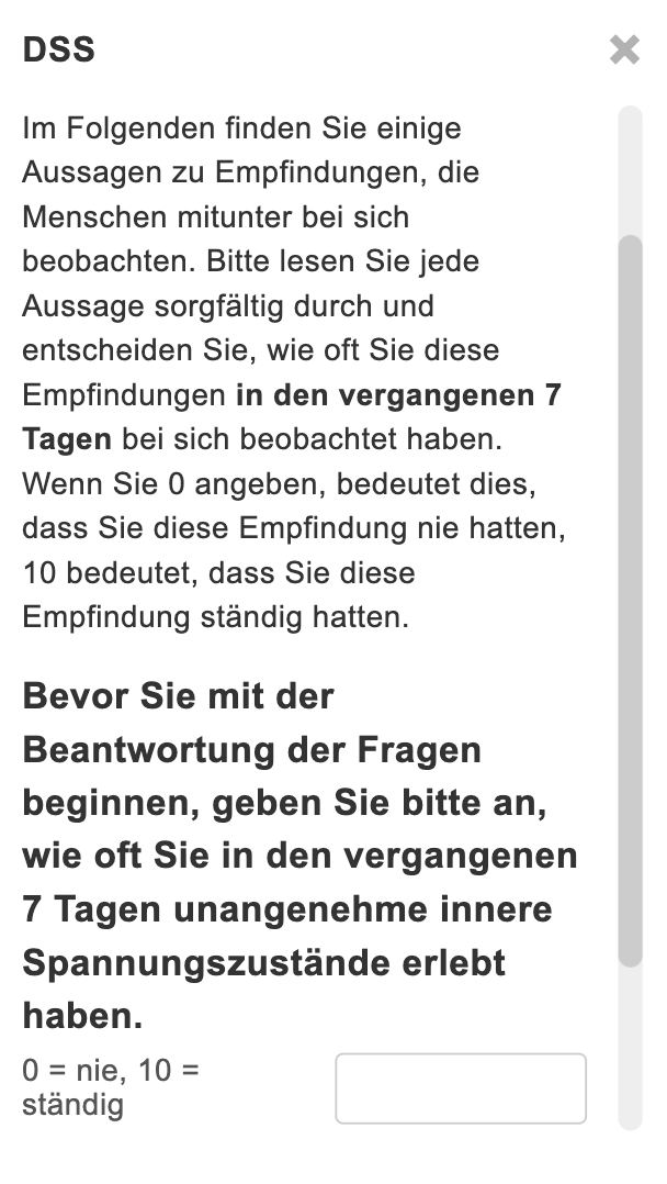 Die DSS umfasst 22 Aussagen zu Empfindungserleben, die auf einer Skala von 0 = “nie“ bis 10 = „ständig“ beantwortet werden können. Die Fragen beziehen sich auf die vergangene Woche.