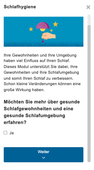 Dieses Modul konzentriert sich auf die Verbesserung der Schlafqualität mithilfe von Schlafhygiene. Der Nutzer erhält Informationen und Tipps zu einem gesunden Schlafrhythmus, schlafförderndem Verhalten sowie einer angenehmen Schlafumgebung. Kurze Videoclips bringen dem Nutzer die Inhalte zusätzlich näher und die Umsetzung schlaffördernder Maßnahmen kann geplant werden.