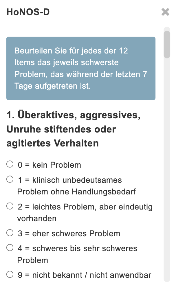 Der HoNOS-D besteht aus 12 Fragen. Das Ausfüllen dauert circa fünf Minuten und die Fragen können auf einer Skala von 1 = „kein Problem“ bis 4 = „schweres bis sehr schweres Problem“ beziehungsweise 9 = „nicht bekannt / nicht anwendbar“ beantwortet werden.
