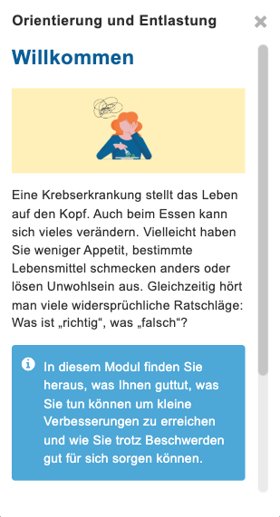 Das Modul bietet Unterstützung, um wieder mehr Sicherheit im Umgang mit der eigenen Ernährung zu gewinnen, individuelle Lösungen zu finden und so mehr Wohlbefinden im Alltag zu erreichen. Mithilfe eines optionalen Ernährungstagebuches können Nutzer:innen ihre täglichen Mahlzeiten, Verträglichkeiten und mit dem Essen verbundene Gefühle festhalten.