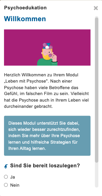 Nach einer Psychose haben viele Betroffene von Psychosen das Gefühl, im falschen Film zu sein. Gefühle von Unsicherheit und Kontrollverlust sind weit verbreitet. Das Modul zielt darauf ab, das Selbstvertrauen der Nutzer:innen im Umgang mit ihrer psychotischen Erkrankung zu stärken.