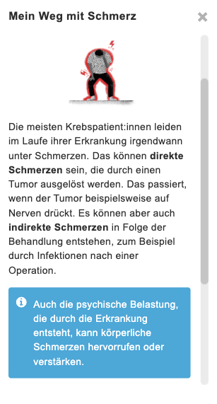 Viele Krebspatient:innen haben Schwierigkeiten, Schmerzen klar einzuordnen, angemessen zu kommunizieren und passende Bewältigungsstrategien zu finden. Dieses Modul unterstützt dabei, Sicherheit im Umgang mit Schmerz zu gewinnen, unrealistische Annahmen abzubauen und eigene Handlungsmöglichkeiten zu erkennen.