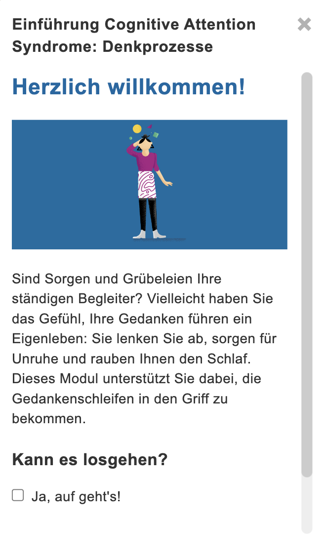 In diesem Modul erfahren die Nutzer:innen mehr zu metakognitiven Überzeugungen, die dysfunktionalen Denk- und Aufmerksamkeitsprozessen zu Grunde liegen können. Mithilfe von Experimenten und kritischen Fragen überprüfen sie ihre positiven und negativen Metakognitionen. Dies unterstützt die Veränderung hinderlicher Metakognitionen und kann zur Entwicklung eines hilfreichen Umgangs mit unangenehmen Gedanken und Gefühlen beitragen.