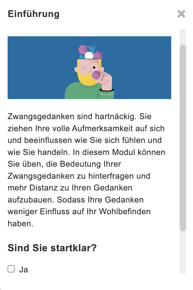 Zwangsgedanken sind hartnäckig. Sie ziehen die volle Aufmerksamkeit der Betroffenen auf sich und werden als besonders bedeutsam und wahr bewertet. Somit beeinflussen sie die Gefühle und das Verhalten von Menschen mit Zwangserkrankung. Ziel des Moduls ist ein verbesserter Umgang mit Zwangsgedanken.