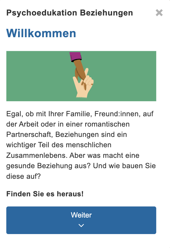 Das Modul begleitet bei der Reflexion der eigenen (romantischen und nicht-romantischen) Beziehungen und unterstützt dabei, nicht hilfreiche Muster zu erkennen. Zunächst wird mithilfe von Psychoedukation vermittelt, was eine gesunde Beziehung ausmacht und welche positiven Effekte diese haben kann. Nutzer:innen können ihr momentanes soziales Netzwerk analysieren und überlegen, was sie gerne verbessern würden. Anschließend können sie sowohl ihr Selbsterleben reflektieren als auch mithilfe von Übungen lernen, die Perspektiven von anderen in sozialen Interaktionen zu übernehmen.