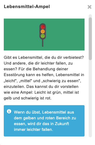 „Wunderfrage und Skalierung” hilft, einen optimalen Zustand, ohne das Problem, zu beschreiben und den ersten Schritt in diese Richtung zu planen. Die „Lebensmittel-Ampel” bereitet die Lebensmittelexposition vor, indem Lebensmittel nach Essschwierigkeit in grün, gelb und rot eingeteilt werden.