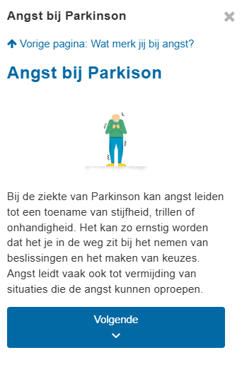 Als iemand een ziekte heeft zoals Parkinson, kunnen ook angstklachten er anders uitzien. Je kunt piekeren over het verloop van de ziekte, bang zijn hoe anderen reageren, of paniek ervaren. In deze zelfhulpmodule ontdekken mensen hoe dat bij hen zit en en krijgen ze handvatten.