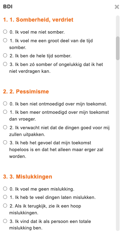 Cliënten vullen de BDI in over hun ervaringen van de afgelopen 2 weken. De BDI invullen kost 5 tot 10 minuten. Je zou de BDI elke twee weken kunnen aanbieden, maar kunt er ook meer tijd tussen laten. De BDI is in te vullen via de Minddistrict app en kan ook als ROM worden gebruikt.