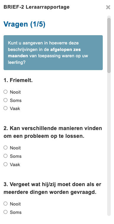 De BRIEF-2 vragenlijst bestaat uit meerdere beoordelingen: