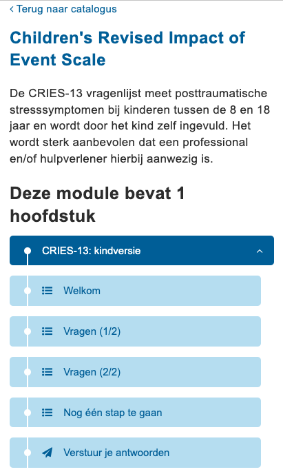 De vragenlijst is ontwikkeld door E. Verlinden, M. Olff en R.J.L. Lindauer, 2005. Gebaseerd op de CRIES-13 versie voor kinderen, Children and War Foundation, 1998 ©.