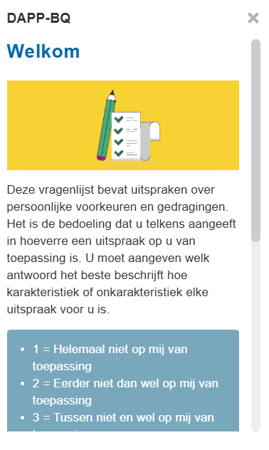 Om een eerste inschatting te maken van mogelijk pathologische persoonlijkheidskenmerken, is het gebruik van een vragenlijst nuttig. De DAPP-BQ en de kortere versie ervan, de DAPP Screening, meten 18 dimensies op basis van de DSM-V en ICD-10.