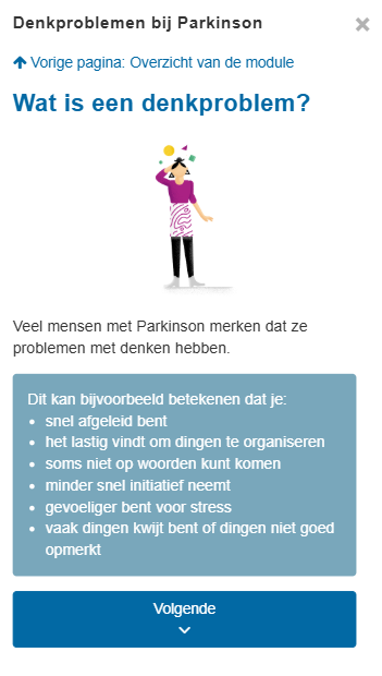 De module is ontwikkeld voor mensen met de ziekte van Parkinson. Denkproblemen komen veel voor. Daarom geeft deze module informatie over welke denkproblemen gerelateerd kunnen zijn aan Parkinson, en hoe mensen daarmee om kunnen gaan. De module kan ook nuttig zijn voor naasten, zoals een partner, vrienden of familie.