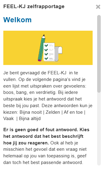 Met de FEEL-KJ breng je de strategieën in kaart die een kind of jongere gebruikt om diens emoties te reguleren. De doelgroep zijn kinderen en jongeren van 8 tot 18 jaar.