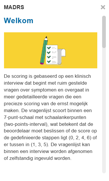 De MADRS is bedoeld voor volwassenen met depressie en angst. Het doel van de vragenlijst is inventariserend en evaluatief/effectief.