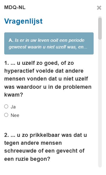 De MDQ-NL is ontwikkeld als screeningsinstrument voor volwassenen met een mogelijke bipolaire stoornis.