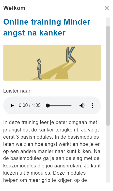 De module is bedoeld voor mensen die angst ervaren na kanker. Het doel van de module is om volwassenen te leren hoe beter om te gaan met angst voor terugkeer van kanker door meer grip te krijgen op angst.