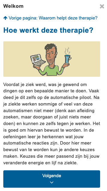 De therapie bestaat uit acht sessies waarin de patiënt door veel oefenen inzichten krijgt die helpen anders om te gaan met vermoeidheid en andere belemmeringen. Het oefenen vraagt 11 weken lang zeker 30 minuten per dag. De therapie start met een introductie waarin de patiënt ontdekt waarom vermoeidheid vaak voorkomt na het doormaken van een ernstige ziekte, welke factoren hierbij een rol spelen, hoe deze therapie daarbij helpt, waar deze op is gebaseerd en hoe de therapie is opgebouwd. In de daaropvolgende sessies gaat de patiënt veel oefenen om bewust te worden van signalen van het lichaam. De patiënt krijgt inzicht in automatische reacties en werkt toe naar het maken van andere keuzes. De patiënt vult tijdens het hele proces dagboeken in die waardevolle inzichten geven voor de patiënt en voor de reflectiemomenten met de zorgverlener.