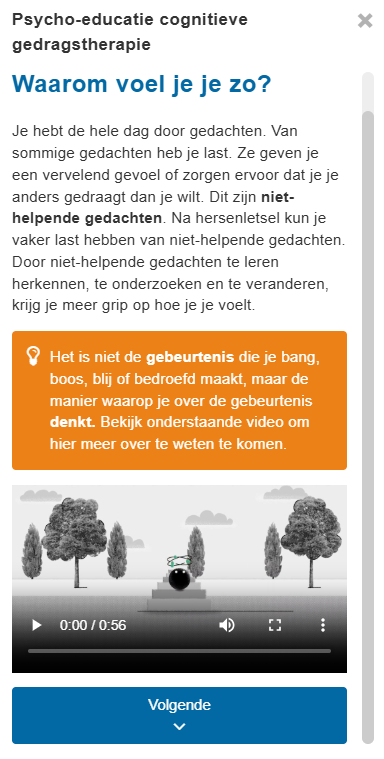 De module is ontwikkeld voor volwassenen met niet-aangeboren hersenletsel die last hebben van niet-helpende gedachten en belemmerende gevoelens en/of gedragingen. Het doel van de module is om de cliënt inzicht te geven in zijn of haar niet-helpende gedachten en een meer helpende manier van denken aan te leren.