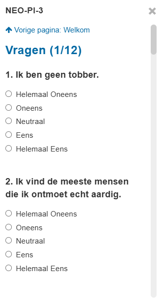 Krijg inzicht in persoonlijkheid: deze vragenlijst meet de 5 belangrijkste domeinen van persoonlijkheid. De vragenlijst is geschikt voor gebruik in de zorg voor cliënten, maar kun je ook gebruiken in een werkomgeving of tijdens trainingen.