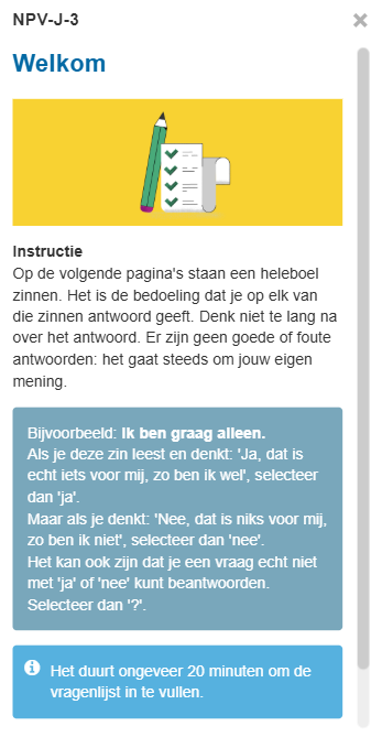 De NPV-J-3 kun je bij elk kind dat testbaar is vanaf 8 jaar tot en met 16 jaar afnemen. De vragenlijst wordt gebruikt in de GGZ en in het onderwijs.