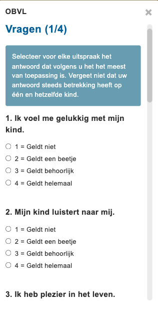 De OBVL is een digitale vragenlijst en bestaat uit 34 stellingen over het ouderschap. Ouders of verzorgers geven per stelling aan in hoeverre deze op hen van toepassing is, op een schaal van 1 (de uitspraak geldt niet voor mij) tot 4 (de uitspraak geldt helemaal voor mij).