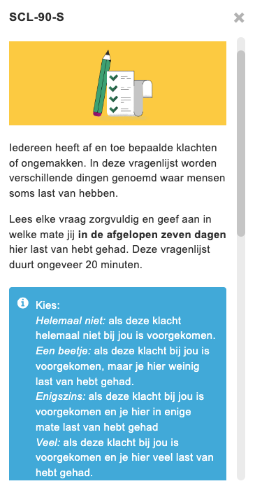 De vragenlijst meet of en hoeveel last iemand de afgelopen 7 dagen had van de gevraagde psychische klachten. Cliënten kunnen deze zelfrapportage vragenlijst invullen via de Minddistrict app. Het invullen duurt ongeveer 20 minuten.