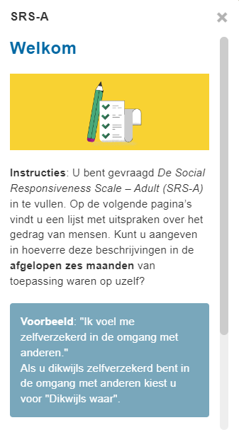 SRS staat voor Social Responsiveness Scale. A staat voor ‘adult', en is een vragenlijst voor volwassenen. De 2 staat voor ‘tweede versie’, deze lijst is bedoeld voor informanten: volwassenen die de vragenlijst invullen over kinderen en jongeren.